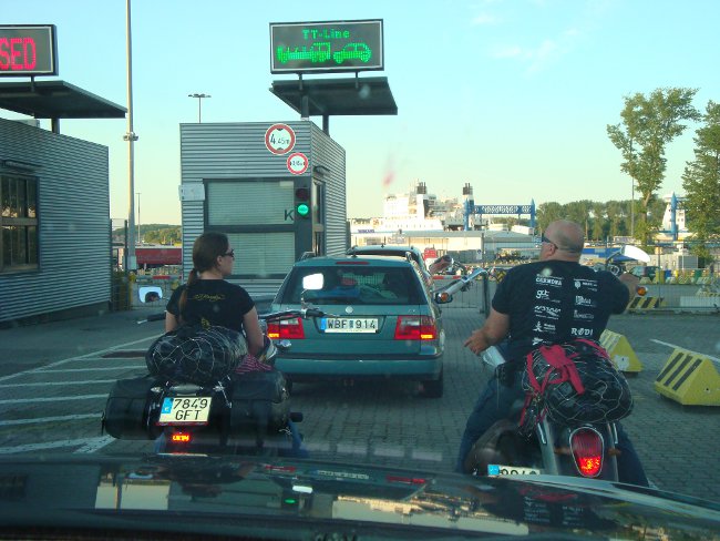 Vam anar directes cap al port, doncs no havíem reservat els passatges i no teníem clar si aquest ferri normalment s'omplia. Al taulell de reserves ens van recomenar un altre ferri més econòmic que sortia l'endemà, però nosaltres preferíem el ferri que sortia aquell vespre i que ens va costar 592 € perquè viatjava de nit (estalvi de temps) i així no havíem d'agafar hotel aquella nit (estalvi de diners). La intenció era agafar els bitllets i acostar-nos a Lübeck per visitar una botiga de la cadena Louis, a més així podríem reposar els estris de càmping que ens havien robat, però com que vam acabar arribant al port una mica més tard del que esperàvem i vam veure les cues de vehicles a les carreteres, vam preferir no moure'ns d'allà, no fos cas que acabèssim perdent el vaixell. |