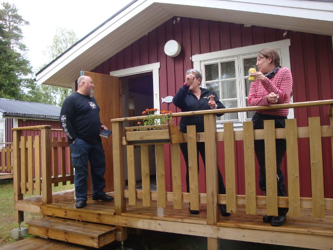 A la terrassa de l'edifici principal i sota un cel que enlloc d'enfosquir-se s'anava aclarint cada cop més, vam prendre uns patxarans i uns Bacardís amb cola mentre decidíem que l'endemà faríem nit a Rovaniemi i que el dia següent passaríem tot el matí a la casa del Pare Nöel i al creuament del Cercle Polar Àrtic, confirmant que pujaríem per Finlàndia i endarrerint un dia l'arribada teòrica a Nordkapp. |