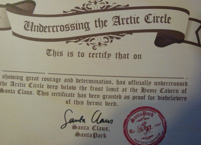 Tal i com s'indicava en el cartell de l'entrada, dintre del parc es creua el Cercle Polar Àrtic (és l'únic lloc del món on es pot fer de forma subterrània) i la Princesa del Gel et pot expedir un certificat (previ pagament d'uns calerons, és clar). |