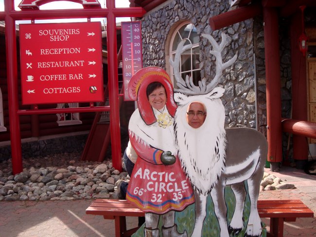 Lògicament, el que atrau més l'atenció és la línia al terra representant el paral·lel de latitud N 66º 33' 45" i tothom juga a estar a les dues bandes, travessar-lo agafats de la mà (vam veure un grup de més de cinquanta persones que ho va fer així), donar-se la mà amb algú a l'altra banda... |