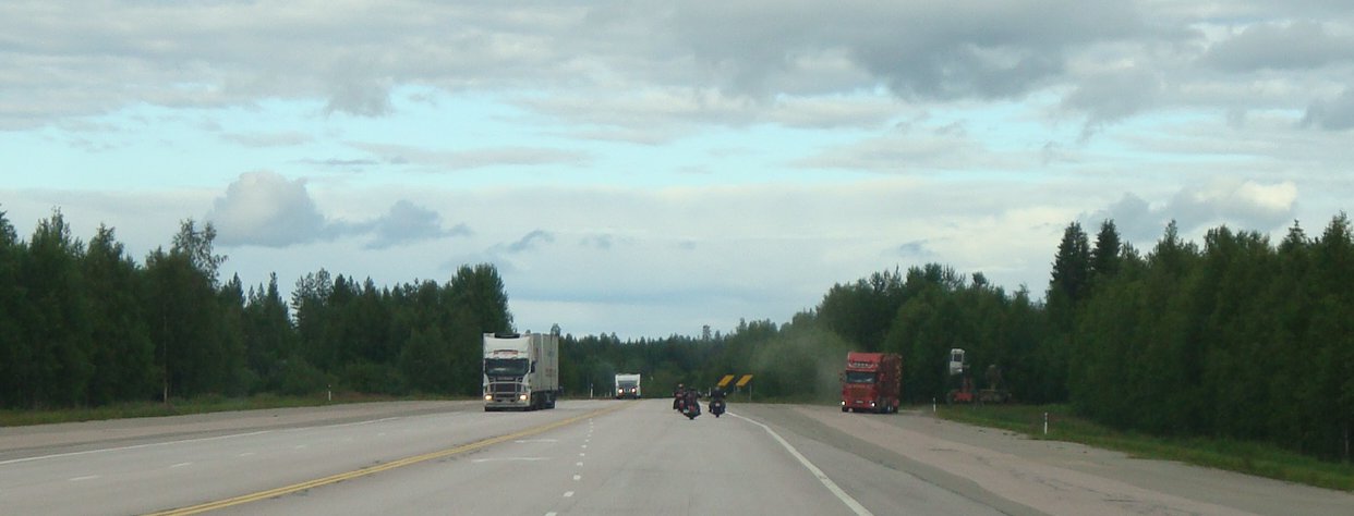 Per l'E75 direcció nord només deixàvem d'estar envoltats per boscos quan teníem aigua d'algun llac a algun cantó (o a ambdós alhora) i continuàvem veient rens, que feien que circuléssim vigilant de no trobar-nos-els al mig de la carretera o intentant creuar-la. |