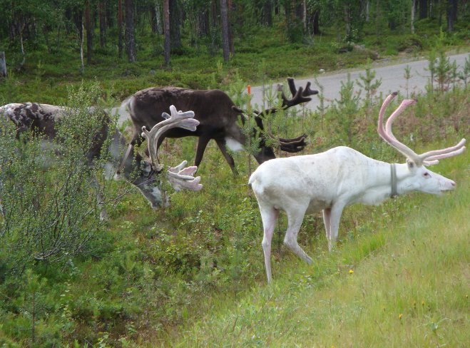 Vam continuar viatge cap al nord i en un moment donat la Txaro va començar a fer gestos que no enteníem: havia vist un ren! Al cap de no gaire, vam trobar-nos un al mig de la carretera i vam començar a veure'n algun de tant en tant, però vèiem més parades d'autobús o llacs (estava ple) que no pas rens. |