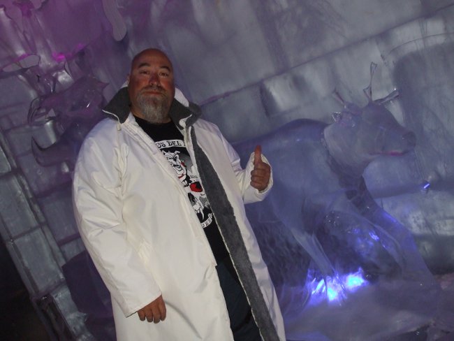 Convidats per la Princesa del Gel en persona, vam entrar en una habitació plena de figures d'animals tallades en el gel, on també hi havia el tron de la princesa, una barra i un llit també de gel. El Pedro i jo no teníem pas fred allà dins i ho vam voler mostrar a la càmera de fotos i no sé si va ser de l'energia acumulada o què, però en seure al tron de la princesa, vaig carregar-me un dels recolza-braços, circumstància que va precipitar la nostra sortida, evitant-nos l'intent de vendre'ns uns xupitos en un got de gel. |