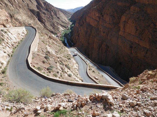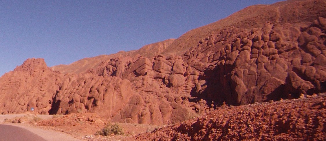 Vam seguir en direcció a Boulmaine de Dadès, tornant a passar per davant de les roques amb formes estranyes, i allà vam tornar a agafar l'N10, que en aquell tram es va convertir en una successió d'obres a la calçada. A més, els pobles s'enllaçaven els uns amb els altres, formant una travessia de més de trenta quilòmetres. |