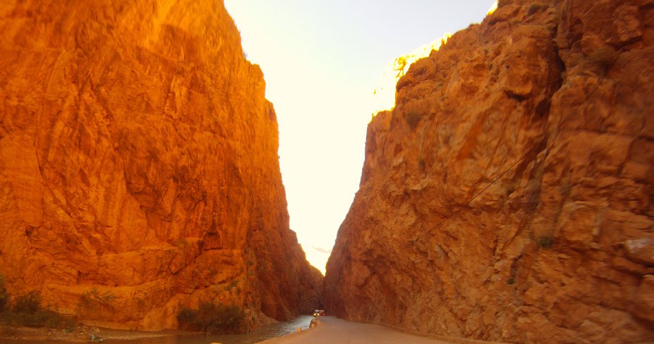 Per tornar a agafar l'N10, vam tornar a patir amb els forats i la grava a la calçada, però aquest cop gaudint de les vistes del palmeral que hi ha a la riba del riu per sota de les gorges i dels tons vermellosos de les roques i les edificacions. |