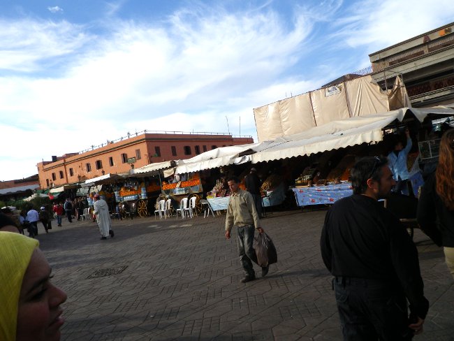 De tornada a la famosa plaça, vam trucar per telèfon al riad i amb l'ajuda d'una noia que ens va fer de traductora i de guia, vam encertar el carrer pel que s'hi arribava, malgrat que llavors el complicat va ser passar-hi, doncs no feia ni tres metres d'ample i hi havia paradetes a banda i banda... Tot i així, mentre intentàvem passar, ens va adelantar a tota velocitat un scooter! |