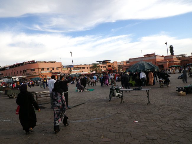 Vam arribar a Marràqueix i ens vam anar endinsant per tal d'apropar-nos a la Plaça Djemà-el-Fna, doncs el riad que teníem reservat era a tocar de la plaça, però vam acabar entrant a la medina per la banda que no tocava i fent una bona volta. Finalment, vam trobar-la i com que el Google Maps ens deia que havíem d'entrar al carrer del riad des d'allà, vam creuar-la amb les motos i vam acceptar l'ajuda d'un noi que, sense jo voler-ho, se'm va pujar al darrera. El que passa és que o no sabia on era el riad o ens volia enredar i dur-nos a un altre o ves tu a saber què, el cas és que vam acabar dient-li que baixés i discutint-nos amb ell, que encara pretenia uns diners per una feina que no havia fet. |