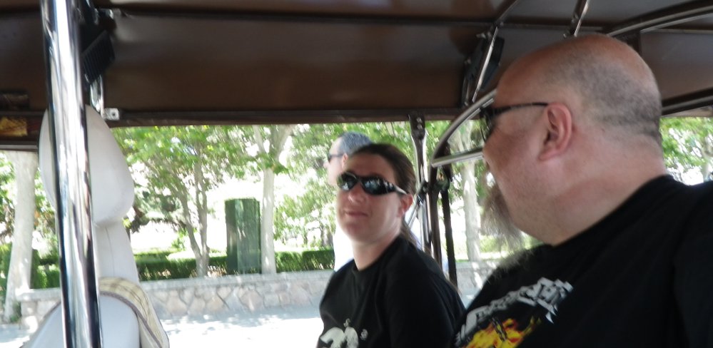 Vam veure passar un trenet i vam pensar que seria una bona manera de fer una visita ràpida a la ciutat i mentre estàvem intentant informar-nos una noia ens va oferir el servei d'un petit vehicle (una moto amb lloc pel conductor i dues files de seients) que també voltava Àvila mentre pels altaveus s'explicava allò que es veia. Ens ho vam pensar bé i vam decidir esperar a l'ombra el quart d'hora que faltava per la sortida del següent tour guiat. |