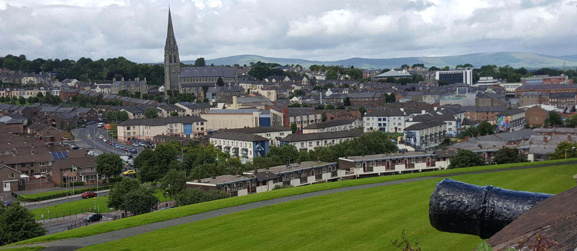 El centre històric encara conserva la muralla defensiva, nosaltres la vam travessar per Ferryquay Gate i vam dirigir-nos cap a The Diamond, on hi ha un memorial als habitants de la ciutat que van morir a la I Guerra Mundial, vam acabar de creuar tot el centre i vam pujar a la muralla per recòrrer-la sencera. |