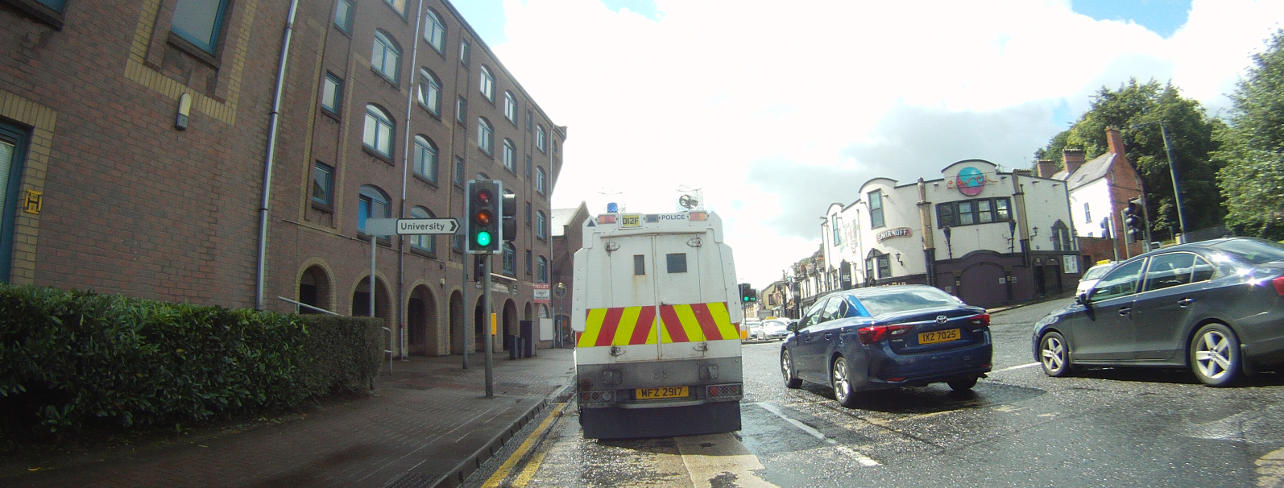 Vam entrar a l'Ulster i la veritat és que vam notar certes diferències: més trànsit, més gent, carreteres més modernes, moltes union jack i policia molt militaritzada. |