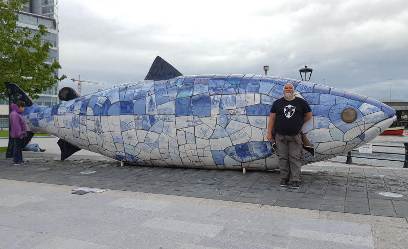 A l'altra riba del Lagan, vam trobar-nos un inmens salmó de 32 peus de llargada conegut com The Big Fish que celebra la tornada al riu de la seva espècie el 1999, després de la regeneració en la que tanta influència hi va tenir la presa. Les escates són rajoles de ceràmica on hi ha escenes i històries quotidianes de Belfast. |